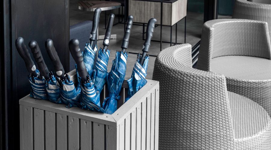 雨の日に訪れるお客様のために、傘立ては便利なアイテムです。床の濡れを防ぎ、快適な空間を提供します。