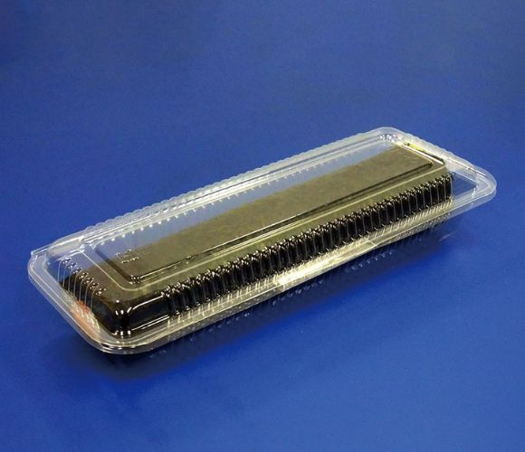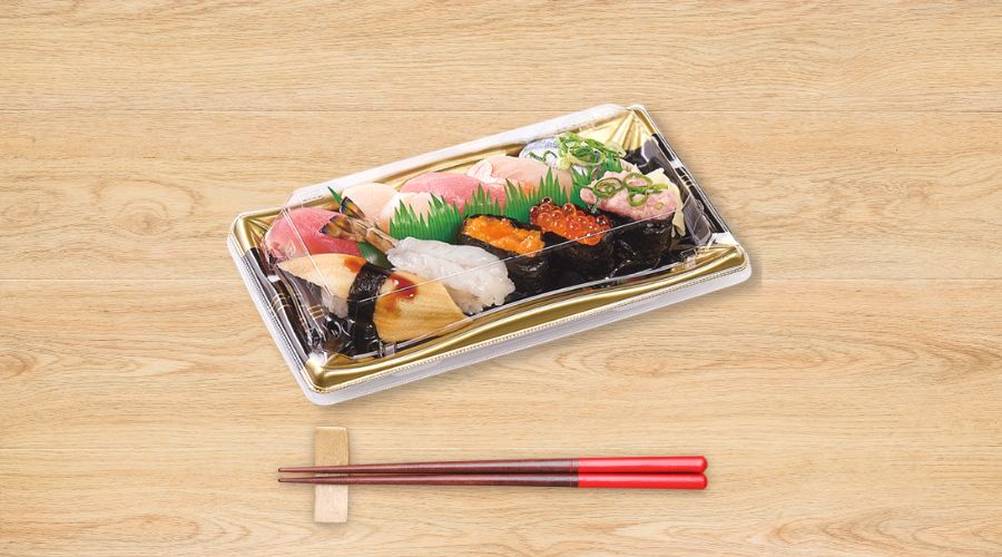 寿司容器とは、主に寿司の持ち帰りのために使われる使い捨て容器のことです。握りずしが並べられる高級感のある黒い容器や、巻き寿司を入れられる長い透明フードパック、パーティーなどでも使える寿司折や寿司桶など、様々なタイプがあります。寿司容器の多くは透明の蓋とセットで使うことで、お寿司の鮮やかな見栄えも生かすことができます。
