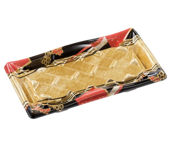 スーパーの総菜コーナーに並んでいる寿司などの陳列に使われる定番のパックです。本体は高級感の溢れる黒地に金や赤の柄が入っており、透明の蓋と組み合わせて使うのが一般的です。サイズやデザインも豊富で、選択肢が多いのが魅力です。