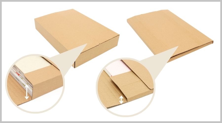 多当式ダンボールは高さが5段階で調節ができます。それぞれ13.5mm間隔で空いており、高さは最大で54mmになります。段ボールの高さを調節することで、内容物に対してピッタリと梱包することができ、余分な緩衝材を使わずに済みます。ネット通販やフリマアプリなどの発送におすすめ。