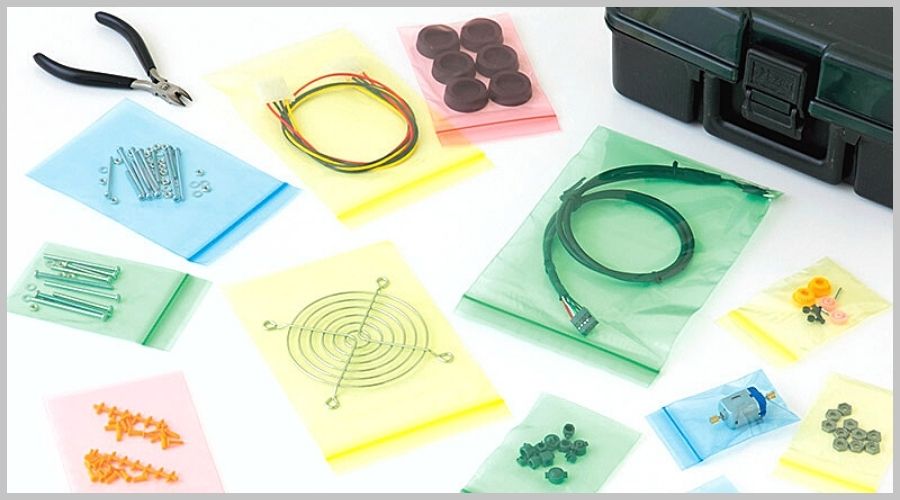色付きのユニパックを使用すれば、部品や資料の分類分けが可能です。ぱっと一目でわかりやすく利便性の向上につながります。