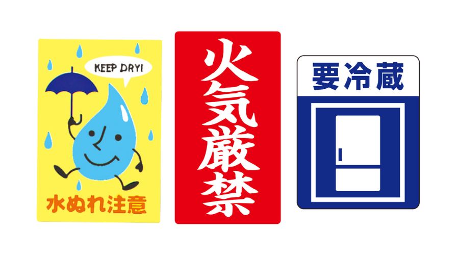「水濡れ注意」、「火気厳禁」、「要冷蔵」など、特定の環境にさらされると劣化や破損してしまうものの注意喚起を行うことが出来ます。配送環境に特に注意してほしいものには、このシールを貼るとよいでしょう。