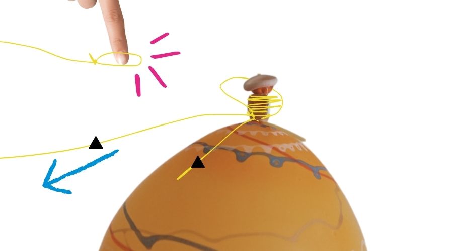 糸ゴムの輪っかをヨーヨーの口元にかけ、▲部分の糸ゴムを強く引っ張れば完成です。最後に、糸ゴムの端に指を通して遊ぶための輪を作ってあげましょう。