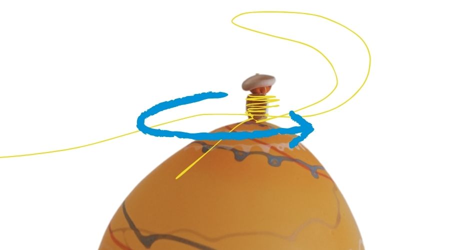 折り曲げた糸ゴムを強く引っ張りながらヨーヨーの口元に4,5回巻きつけます。この時、口元のねじれが元に戻ってしまわないよう注意しましょう。